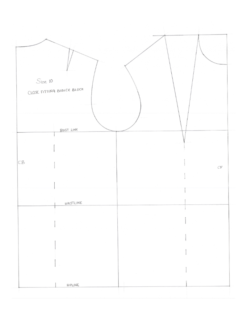 To make the sample, we draft the pattern of the selected design in an average size (e.g. medium), starting with the basic block, then adapting to the working pattern, and then extracting the final pattern.